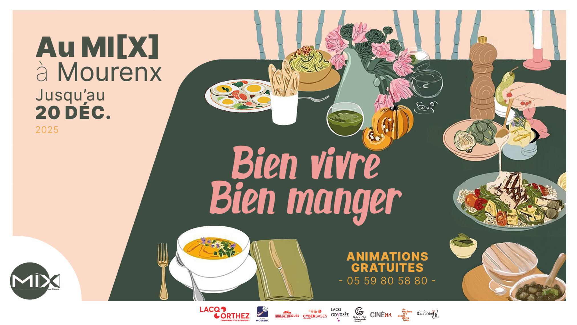 Pendant plus d’un mois, le MI[X] à Mourenx invite à explorer les plaisirs et les enjeux de l’alimentation à travers une programmation riche et variée : exposition, ateliers culinaires, conférences et rencontres littéraires.